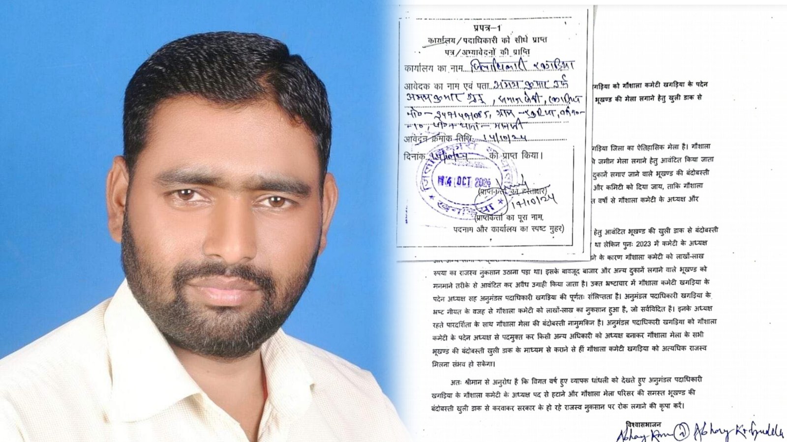 खगड़िया के सदर एसडीओ को गौशाला कमेटी खगड़िया के पदेन अध्यक्ष के पद से हटाने तथा मेला लगाने के लिए गौशाला मेला खगड़िया के सभी भूखंड की खुली डाक से बंदोबस्ती कराने की मांग को लेकर सामाजिक कार्यकर्ता अभय कुमार गुड्डू ने सोमवार को डीएम को आवेदन दिया है। दिए गए आवेदन में गुड्डू ने कहा है कि गौशाला मेला खगड़िया जिला का ऐतिहासिक मेला है। गौशाला कमेटी खगड़िया द्वारा औने-पौने तरीके से गौशाला परिसर की जमीन मेला लगाने के लिए आवंटित किया जाता है। इस वर्ष 2024 में गौशाला मेला में झूला, बाजार व अन्य दुकानें लगाए जाने वाले भूखंड की बंदोबस्ती खुली डाक के माध्यम से कराने का आदेश संबंधित अधिकारी और कमेटी को दिया जाए, ताकि गौशाला कमेटी खगड़िया को अधिक से अधिक राजस्व मिल सके और विगत वर्षों से गौशाला कमेटी के अध्यक्ष और सदस्यों द्वारा किए जा रहे लूट-खसोट पर विराम लग सके। उन्होंने कहा कि वर्ष 2022 में झूला लगाने के लिए आवंटित भूखंड की खुली डाक से बंदोबस्ती करने से गौशाला कमेटी को 43 लाख रुपया का राजस्व मिला था। लेकिन पुनः 2023 में कमेटी के अध्यक्ष और अन्य लोगों के द्वारा व्यापक पैमाने पर धांधली किए जाने के कारण गौशाला कमेटी को लाखों-लाख रुपया के राजस्व का नुकसान उठाना पड़ा। इसके बावजूद बाजार और अन्य दुकानें लगाने वाले भूखंड को मनमाने तरीके से आवंटित कर अवैध उगाही किया जाता है। गुड्डू ने कहा है कि उक्त भ्रष्टाचार में गौशाला कमेटी खगड़िया के पदेन अध्यक्ष सह सदर एसडीओ की पूर्णतः संलिप्तता है।