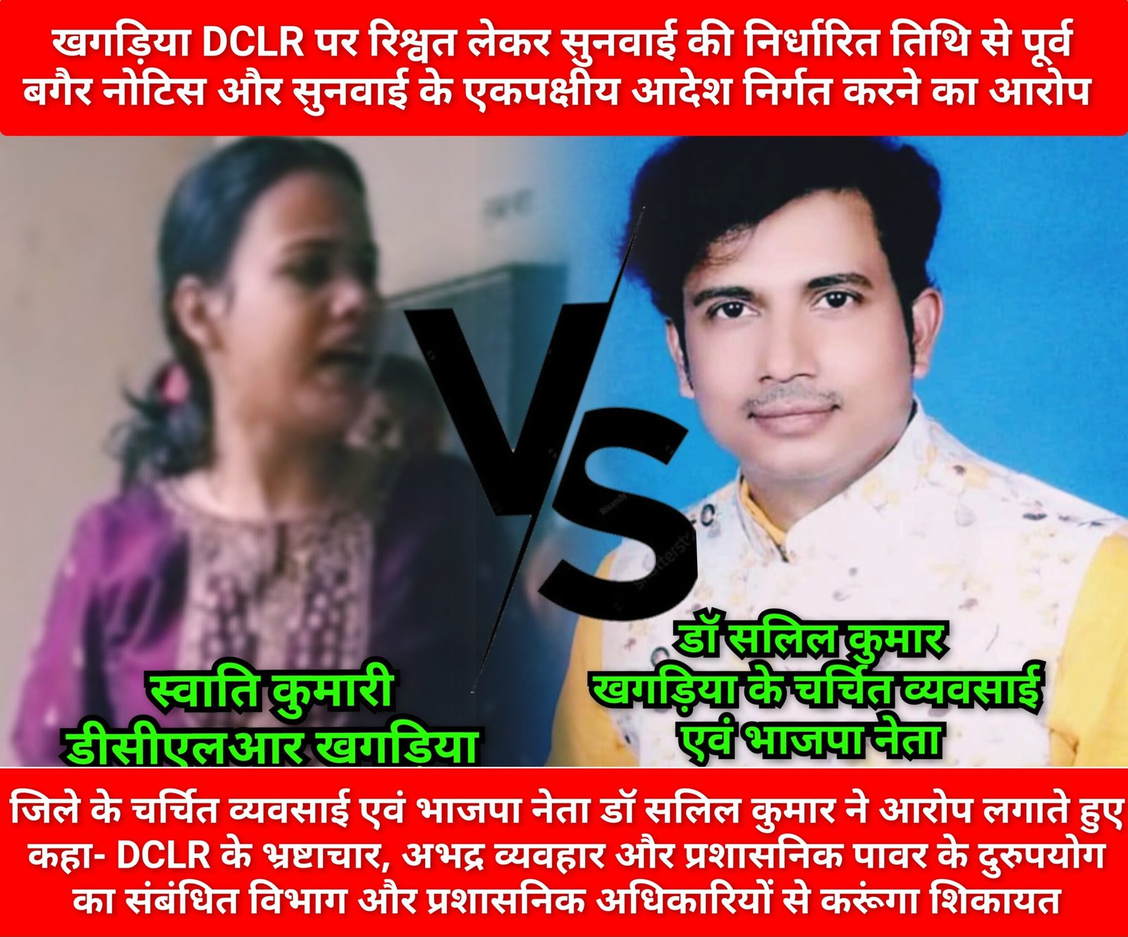 खगड़िया में अपनी ड्यूटी बजाने आए अधिकारी समस्या को समाप्त करने के बजाय मोटी रकम की उगाही कर समस्या और विवाद को और बढ़ा रहे हैं। पब्लिक सर्वेंट पब्लिक को ही सर्वेंट समझ रहे हैं और पवार के तेवर में अपनी हद भूल जा रहे हैं। ताजा मामला खगड़िया सदर डीसीएलआर कोर्ट से जुड़ा है। जहां डीसीएलआर स्वाति कुमारी पर रिश्वत लेकर वाद संख्या 5/24-25 में पक्षकार को बगैर नोटिस किए गलत निर्णय देने का आरोप लगा है। शुक्रवार को प्रेस विज्ञप्ति जारी कर उक्त आरोप लगाते हुए खगड़िया के चर्चित व्यवसाई एवं भाजपा नेता डॉ. सलिल कुमार ने डीसीएलआर पर दूसरे पक्ष से प्रभावित होकर निर्धारित तिथि से पहले नियम के विरुद्ध आदेश जारी करने का आरोप लगाया है। उनका कहना है कि इस मामले में उनके पास कई ठोस साक्ष्य हैं, जिन्हें आवश्यकता पड़ने पर प्रस्तुत किया जाएगा। इतना ही नहीं उन्होंने बताया कि शिकायत करने पर डीसीएलआर ये भी कह रही हैं कि हां मैंने 2 करोड़ रुपए लिए हैं, जिन्हें कहना है कह दो। शुक्रवार को जिले के विभिन्न सोशल मीडिया पर मामले से संबंधित एक वीडियो भी वायरल हुआ है, जिसमें डीसीएलआर स्वाति कुमारी 2 करोड़ लेने की बात स्वीकार रही है। यह मामला न केवल न्यायिक प्रक्रिया पर सवाल खड़ा करता है, बल्कि प्रशासनिक भ्रष्टाचार की ओर भी इशारा करता है। अब देखना यह होगा कि प्रशासन और सरकार इस मामले में क्या कदम उठाते हैं।