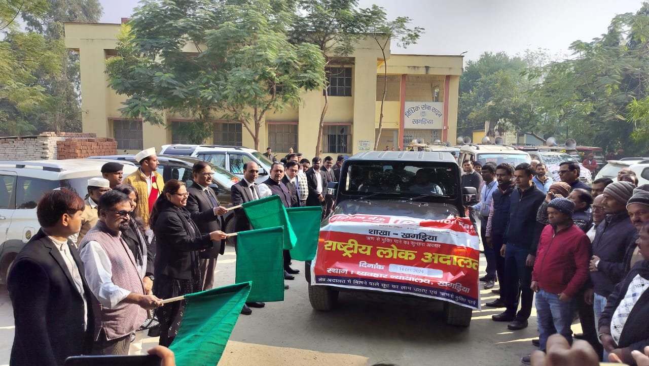 राष्ट्रीय विधिक सेवा प्राधिकरण नई दिल्ली और बिहार राज्य विधिक सेवा प्राधिकरण पटना के निर्देशानुसार जिला विधिक सेवा प्राधिकरण खगड़िया द्वारा 14 दिसंबर 2024 को राष्ट्रीय लोक अदालत का आयोजन किया जाएगा। यह आयोजन सिविल कोर्ट खगड़िया और अनुमंडलीय सिविल कोर्ट गोगरी में किया जाएगा। राष्ट्रीय लोक अदालत के प्रचार-प्रसार के उद्देश्य से 12 दिसंबर 2024 को जिला विधिक सेवा प्राधिकरण खगड़िया परिसर से वाहनों के काफिले को जिले के विभिन्न क्षेत्रों में रवाना किया गया। इन वाहनों को माननीय जिला एवं सत्र न्यायाधीश सह अध्यक्ष, जिला विधिक सेवा प्राधिकरण, खगड़िया काजल झाम्ब, प्रधान न्यायाधीश मनोज कुमार द्विवेदी, सचिव आर. एम. तिवारी, एलडीएम पी.के. सिंह और एसबीआई के मुख्य प्रबंधक मनोहर ठाकुर ने हरी झंडी दिखाकर रवाना किया। जिले के सभी प्रमुख बैंकों, जैसे ग्रामीण बैंक, इंडियन बैंक, यूनियन बैंक, यूको बैंक, पंजाब नेशनल बैंक, बैंक ऑफ इंडिया, और केनरा बैंक, ने प्रचार वाहनों की उपलब्धता में सहयोग किया। इन वाहनों के जरिए शहरी और ग्रामीण क्षेत्रों में लोक अदालत की जानकारी साझा की जाएगी।