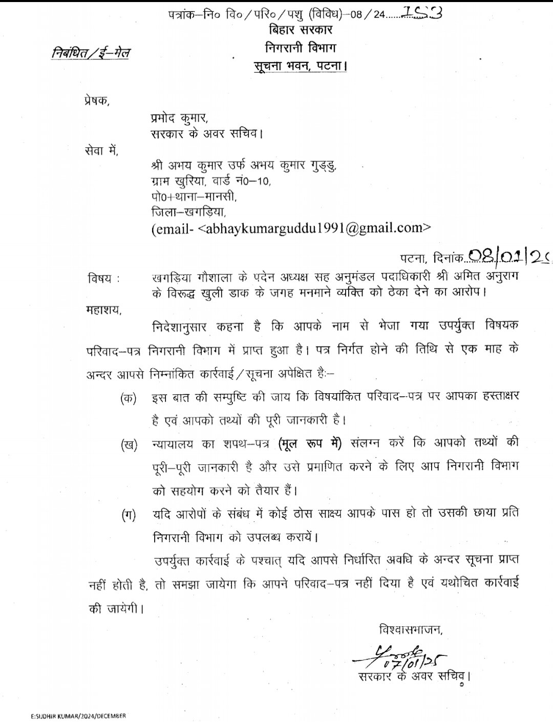 खगड़िया में गोशाला मेला बंदोबस्ती प्रकरण में गंभीर अनियमितताओं का मामला सामने आया है। समाजसेवी अभय कुमार गुड्डू ने निगरानी विभाग के प्रधान सचिव को ईमेल के जरिए पत्र भेजकर खगड़िया सदर एसडीओ अमित अनुराग पर वर्ष 2023 में मनमानी करते हुए गोशाला मेला का ठेका अपने चहेते व्यक्ति को देने के आरोप लगाए हैं। आवेदक ने आरोप लगाया कि खुली डाक के बजाय बंदोबस्ती में गड़बड़ी कर राज्य को वित्तीय नुकसान पहुंचाया गया। मामले की जांच का जिम्मा निगरानी विभाग के अवर सचिव प्रमोद कुमार को सौंपा गया है, जिन्होंने आवेदक को साक्ष्य प्रस्तुत करने का निर्देश दिया था।