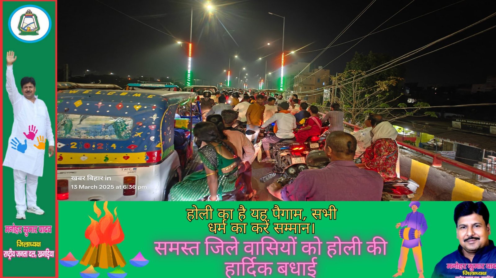 होली की खरीदारी को लेकर शहर में जबरदस्त भीड़ उमड़ पड़ी, जिससे खगड़िया के कई प्रमुख मार्गों पर यातायात व्यवस्था बुरी तरह प्रभावित हो गई है। शहर के आरोबी, महावीर चौक, बेंजामिन चौक, स्टेशन रोड, थाना रोड और बस स्टैंड जैसे महत्वपूर्ण स्थानों पर वाहनों की लंबी कतारें देखने को मिल रही हैं। ग्रामीण इलाकों से भारी संख्या में लोग खरीदारी करने पहुंच रहे थे, जिससे बाजारों में भी खचाखच भीड़ हो गई। दुकानों पर ग्राहकों की लंबी कतारें लगी रही, और लोगों को खरीदारी के लिए घंटों इंतजार करना पड़ा।