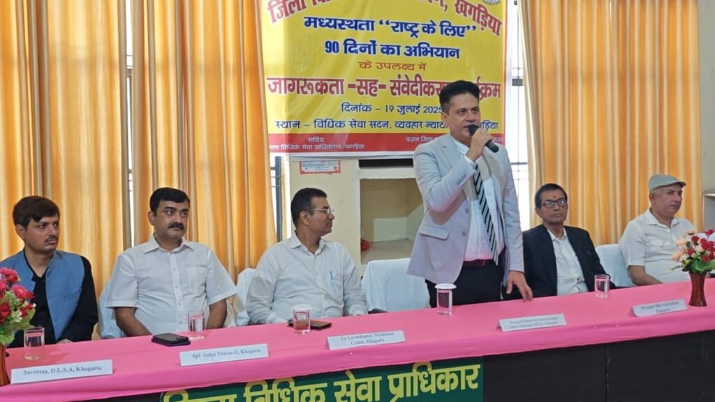 देश भर में न्याय तक त्वरित पहुंच सुनिश्चित करने और लंबित मामलों के बोझ को कम करने के उद्देश्य से, ‘मध्यस्थता – राष्ट्र के लिए’ नामक एक महत्वाकांक्षी 90 दिवसीय अभियान 1 जुलाई, 2025 से पूरे भारत में शुरू हो गया है। इसी कड़ी में, शुक्रवार को खगड़िया में जिला विधिक सेवा प्राधिकार के तत्वावधान में एक महत्वपूर्ण जागरूकता सह संवेदीकरण कार्यक्रम का आयोजन किया गया। इस कार्यक्रम ने जिले में न्यायिक प्रक्रिया में एक नए अध्याय की शुरुआत की है, जिसका लक्ष्य mediation के माध्यम से मुकदमों का शीघ्र निपटारा करना है।