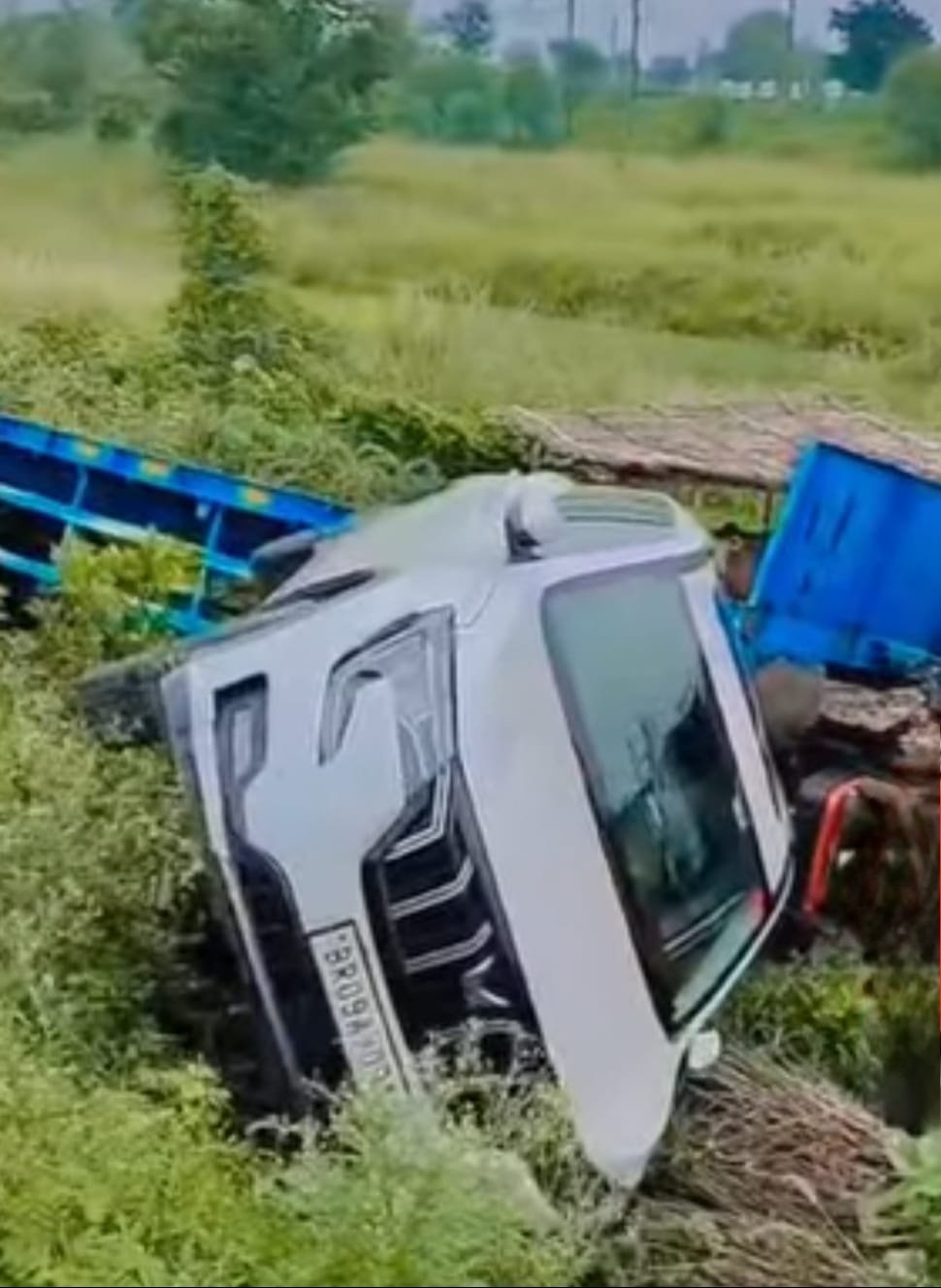 ट्रक-कार की जोरदार टक्कर, दोनों वाहन गड्ढे में गिरे; गाय ने तोड़ा खूंटा, बाल-बाल बची