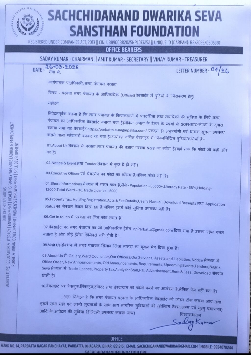 नगर पंचायत परबत्ता द्वारा पारदर्शिता और नागरिकों की सुविधा के उद्देश्य से बनाई गई आधिकारिक वेबसाइट अब खुद सवालों के घेरे में आ गई है। वेबसाइट के निर्माण और संचालन की जिम्मेदारी SOFNETO कंपनी को सौंपी गई थी, लेकिन नगर पंचायत प्रशासन की लापरवाही के कारण यह प्लेटफॉर्म फिलहाल अनुपयोगी और भ्रामक जानकारी देने वाला साबित हो रहा है। इस संबंध में सच्चिदानन्द द्वारिका सेवा संस्थान फाउंडेशन ने नगर कार्यपालक पदाधिकारी को पंजीकृत डाक के माध्यम से पत्र भेजकर वेबसाइट में मौजूद गंभीर कमियों की ओर ध्यान आकर्षित कराया है और तत्काल सुधार की मांग की है।