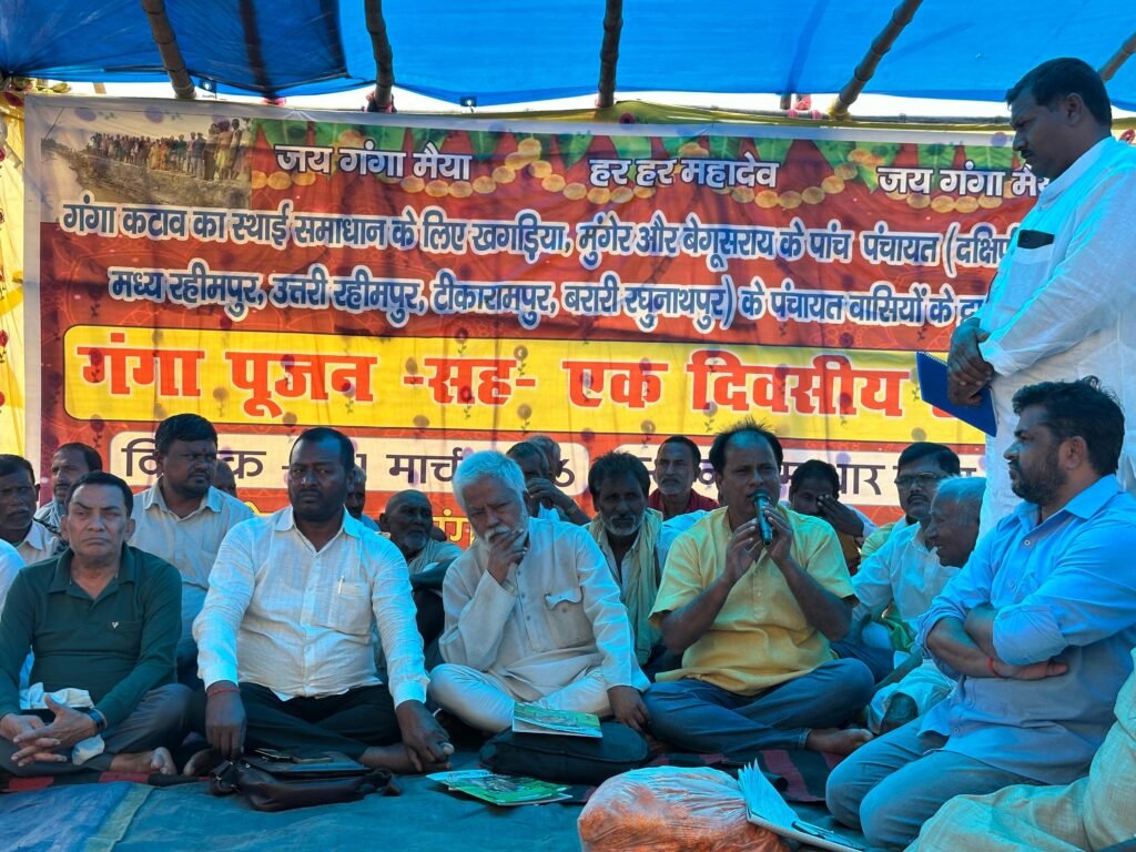 गंगा के लगातार बढ़ते कटाव से तबाही झेल रहे खगड़िया जिले के दियारा क्षेत्र में अब आक्रोश खुलकर सामने आने लगा है। मंगलवार को रहीमपुर दक्षिणी पंचायत स्थित माथार नाव घाट पर कटाव पीड़ित परिवारों द्वारा गंगा पूजन सह एकदिवसीय उपवास कार्यक्रम का आयोजन किया गया, जिसमें हजारों की संख्या में महिलाओं, बुजुर्गों और युवाओं ने भाग लेकर अपनी पीड़ा और आक्रोश को स्वर दिया। कार्यक्रम की अध्यक्षता पूर्व सरपंच शिवनंदन यादव ने की, जबकि मंच संचालन रामपुर गोगरी के मुखिया कृष्णानंद यादव ने किया। सुबह से ही घाट पर श्रद्धा और संवेदना का अद्भुत संगम देखने को मिला। सैकड़ों महिलाओं ने पारंपरिक विधि-विधान से गंगा पूजन किया और हाथ जोड़कर गंगा मां से करुण विनती की—“हे मां, अब लौट जाइए… हमारे आशियाने, खेत-खलिहान और भविष्य को बचा लीजिए।” यह दृश्य न सिर्फ भावुक करने वाला था, बल्कि सरकार के लिए एक स्पष्ट संदेश भी था। कटाव पीड़ितों ने एक स्वर में सरकार से मांग की कि दियारा क्षेत्र को विनाश से बचाने के लिए अविलंब 14 किलोमीटर लंबा बंडाल (तटबंध) बनाया जाए। उन्होंने चेताया कि यदि जल्द कदम नहीं उठाए गए, तो खगड़िया, बेगूसराय और मुंगेर जिले के रघुनाथपुर बरारी, टीकारामपुर, मध्य रहीमपुर, उत्तरी रहीमपुर और दक्षिणी रहीमपुर पंचायतों के गांव और हजारों एकड़ उपजाऊ जमीन गंगा में समा जाएंगे।
