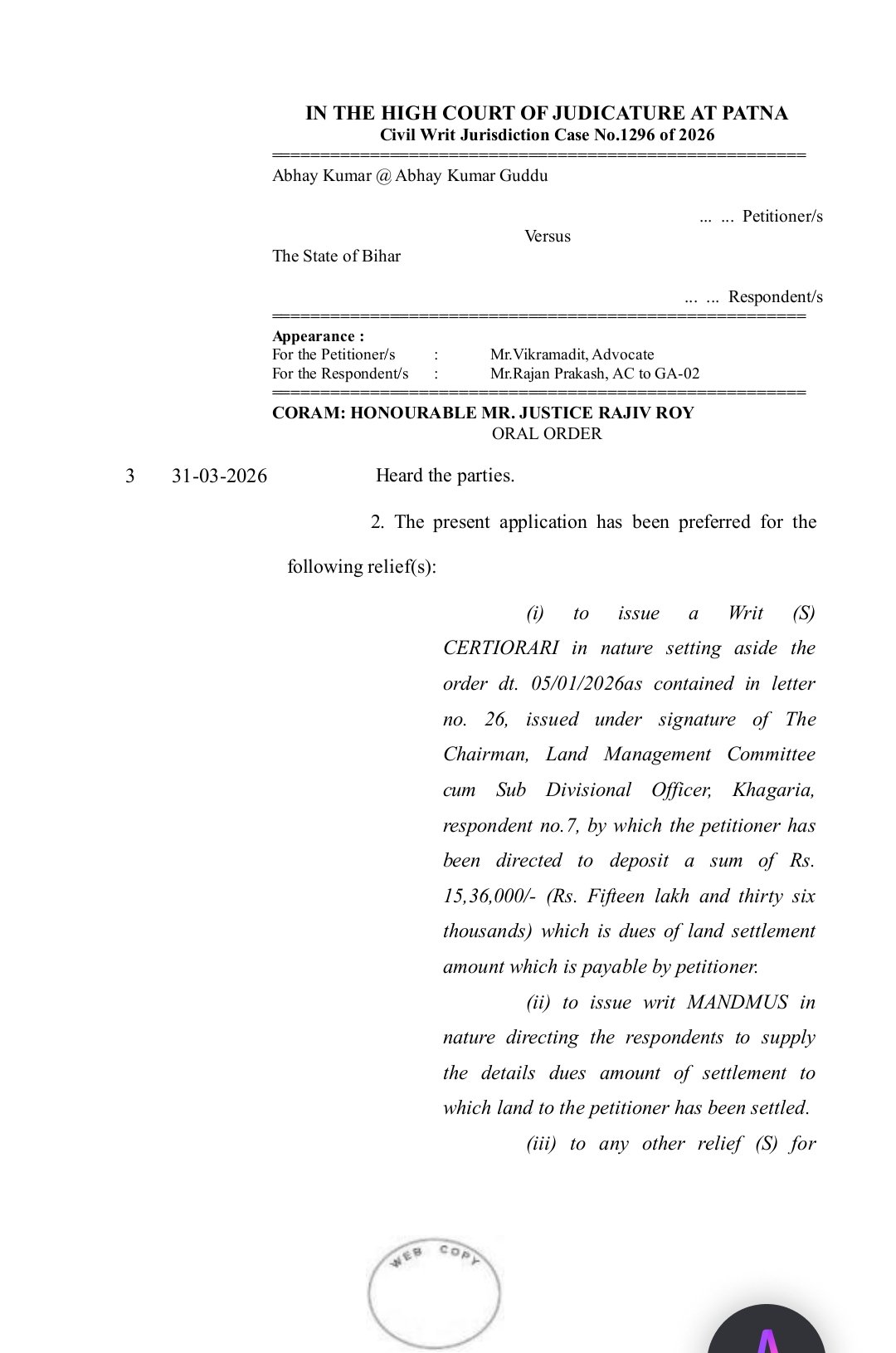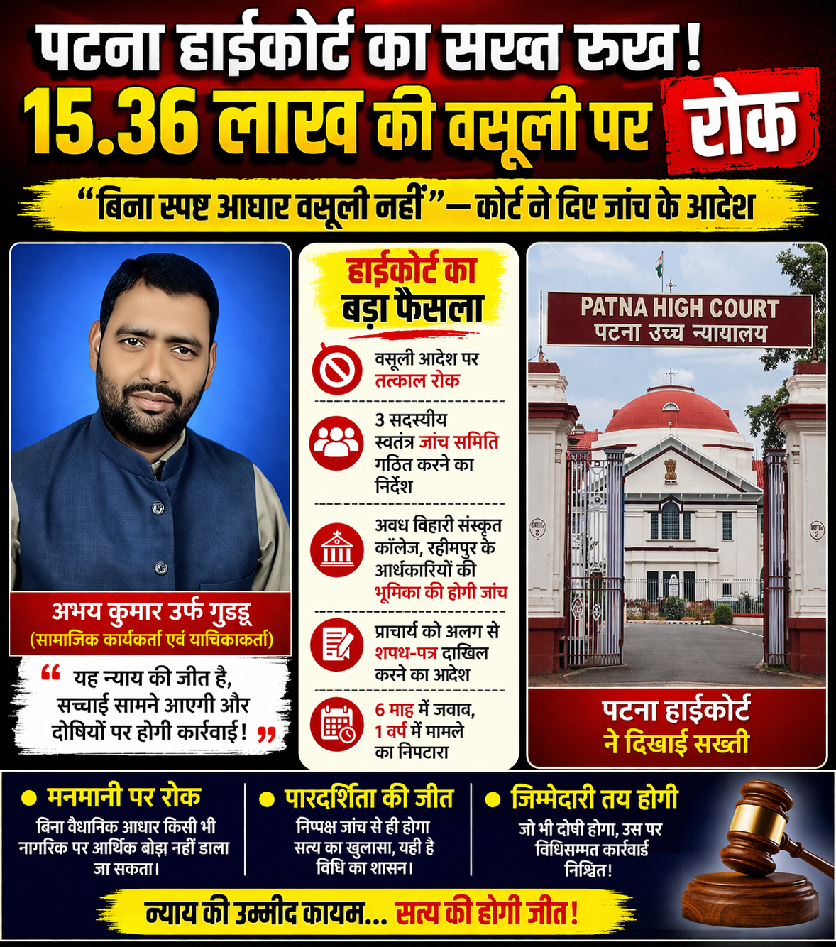 न्याय और पारदर्शिता के मुद्दे पर कड़ा रुख अपनाते हुए पटना उच्च न्यायालय ने 15 लाख 36 हजार रुपये की कथित वसूली के आदेश पर तत्काल प्रभाव से रोक लगा दी है। यह मामला सामाजिक कार्यकर्ता अभय कुमार उर्फ गुड्डू द्वारा दायर दीवानी रिट याचिका (CWJC 1296/2026) से जुड़ा है, जिसने स्थानीय प्रशासनिक कार्यप्रणाली पर गंभीर सवाल खड़े कर दिए हैं। सुनवाई के दौरान कोर्ट ने साफ संकेत दिया कि बिना ठोस दस्तावेज और स्पष्ट विवरण के किसी भी नागरिक पर इतनी भारी आर्थिक देनदारी थोपना न्यायसंगत नहीं है। यह विवाद खगड़िया के अनुमंडल पदाधिकारी सह भूमि प्रबंधन समिति के अध्यक्ष द्वारा जारी वसूली आदेश से जुड़ा है।