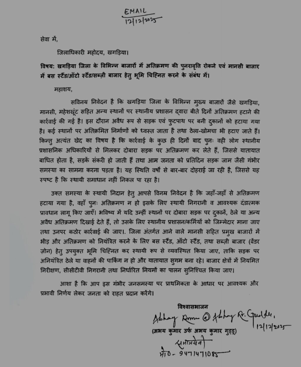 मांग : डीएम से मानसी सहित प्रमुख बाजारों में ऑटो स्टैंड, बस स्टैंड व सब्जी बाजार के लिए स्थल चिन्हित...